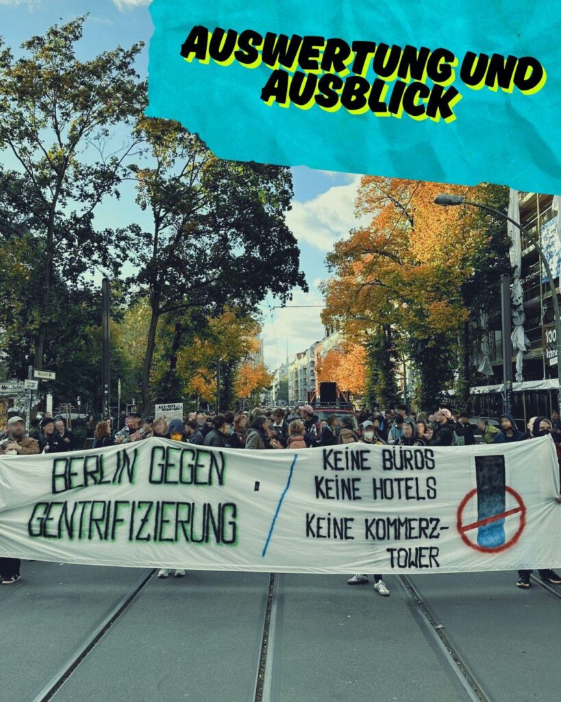 11.10.2025 Demonstration „Weder Büros noch Hotels oder Kommerz-Tower! Der Kiez hat genug!“ Demonstration ab S+U Warschauer Strasse durch Friedrichshain gegen Hochhaus-/Hotelprojekte (u.a. „The Hub“, Projekte von Atrium Development Group).