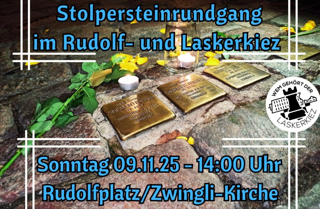 Am 09.11.25 ab 14:00 Uhr werden wir mit einem Stolpersteinspaziergang durch unsere Kieze den Deportierten und Ermordeten gedenken. Im Anschluss fahren wir gemeinsam nach Moabit zur dortigen Gedenkkundgebung und Demonstration. Schließt euch an und gedenkt mit uns den Opfern des Nazi-Terrors! Wir treffen uns um 14:00 Uhr vor der Zwingli-Kirche am Rudolfplatz.